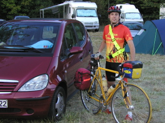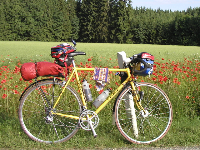 Ich fahre mit meinem 10 Jahre alten Roselli-Rennrad. Es hat einen klassischen Stahlrahmen, 9-fach Campagnolo Schaltung mit 2-fach Kettenblatt, SON-Nabendynamo, B+M LED-Frontlicht und ein LED-Rücklicht. Ich fahre praktisch immer mit einer Lenker-tasche, die langen Strecken mit einem wasserdichten Ortlieb-Packsack auf dem Gepäckträger.